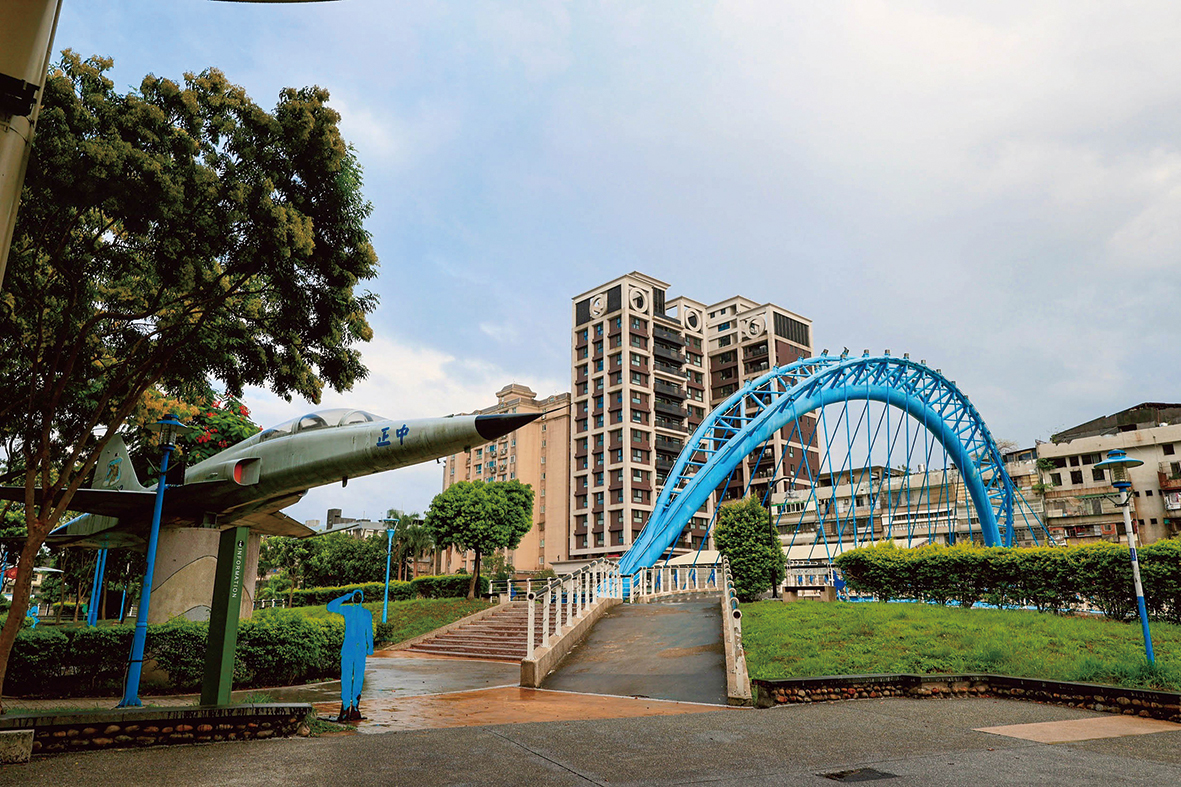 位在龜山區同心二路上的龜山第一河濱公園,順著南崁溪的曲線,河岸除了規劃有桃園第一條水岸自行車道,還有一座造型優美、色彩瑰麗的水藍色星月橋橫跨兩岸,成了當地社區居民散步、休憩的好所在。