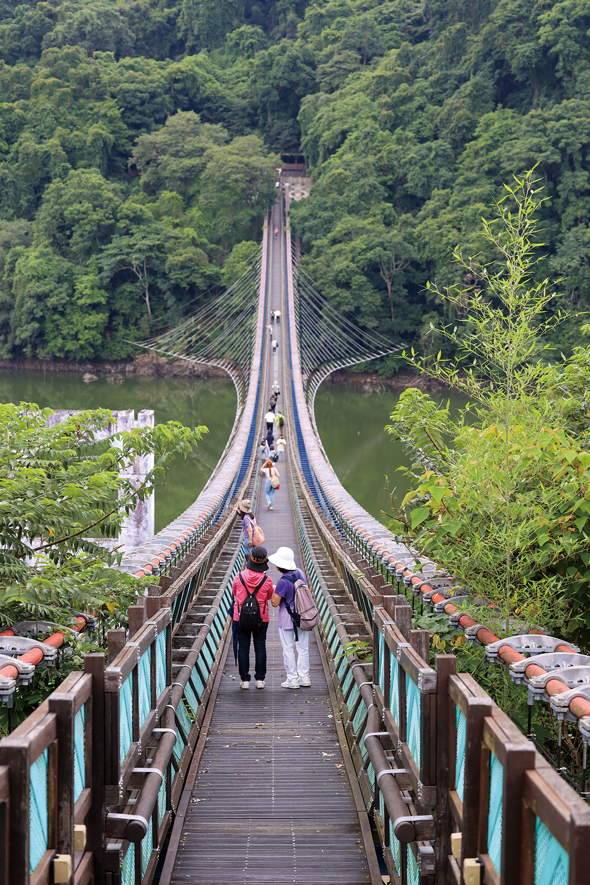 新溪口吊橋全長303公尺,是全台最長的懸索橋,以長虹之姿跨越大漢溪,連結角板山公園和溪口台地,橋身設計有泰雅族圖騰,湖水綠的護欄和層巒疊翠的山景相融合,為河谷增色不少。以往遊客都是乘車從角板山或溪口部落步行進入吊橋,今年水情佳,藍色公路的遊艇可行駛至新溪口吊橋旁的碼頭,下船後直接步行至溪口部落漫步吊橋,不但是最輕鬆抵達的方式,還能從不同的角度欣賞吊橋。