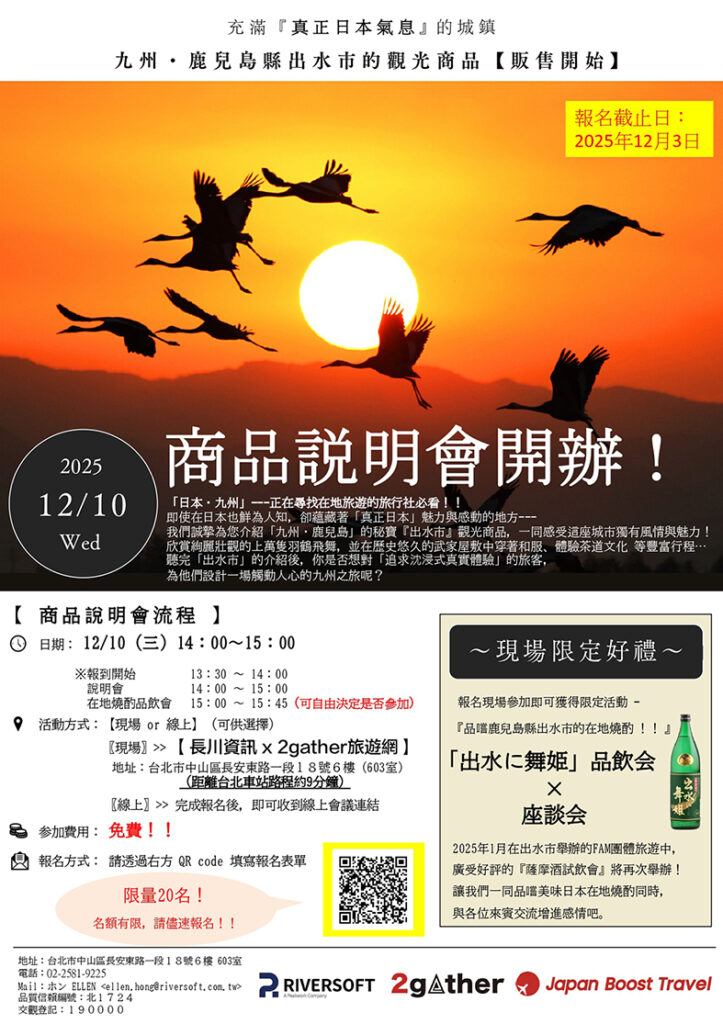 本次由日本Boost Travel、日本出水市、Riversoft與2gather旅遊網共同主辦,特別針對正在規劃日本深度旅遊、地方魅力行程、文化體驗商品的旅行業者量身打造。出水市以「真正日本氣息」著稱,不僅是日本最大規模鶴群越冬地,其自然、文化與飲食風景更極具市場話題性,近年深受台灣旅客關注。