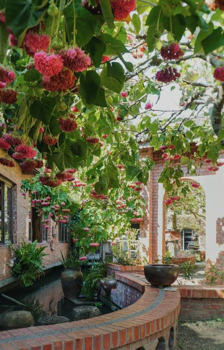 自1984年以來,陳文輝先生在苗栗苑裡的火炎山坡上建立了這座柴燒窯場,並為了給身為花藝家的妻子提供花藝用的花材,開始在園內種植台灣原生植物,讓華陶窯成為集陶藝與花藝於一方的陶園林。華陶窯不僅以深厚的文化景深而聞名,原作為插花花材而栽種的植物更是在視覺上帶來富有季節感的多彩變幻,此時正值冬日白梅盛開,讓寂靜蓊鬱的山林間,更加添了若雪紛飛的潔白情境;而一株開近百朵粉紅色的百鈴花,則如鈴鐺般從樹上垂掛,豐富了整個紅磚黑瓦院庭。