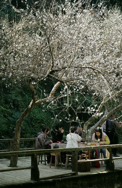 相較於野坡梅林開花時的壯觀,華陶窯將近百棵老梅樹依隨山勢,栽植在落羽松旁的小徑荷塘邊,更因是谷地地形,在花朵盛開時,聚香濃洌。在藍天映襯下,梅花與枝條更顯孤雅蒼勁;當山風拂過,梅花花瓣漫天飛舞,映落於疏影橫斜的小池塘,撒落如雪的細緻花瓣,讓浪漫的梅花散發知性卻也感性的氛圍,此為華陶窯賞梅美景的第一個亮點。